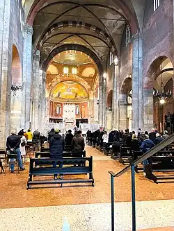 El interior está distribuido en cinco tramos, rectangulares en la nave central y cuadrados en las naves laterales. En comparación con la basílica de San Michele Maggiore, se percibe inmediatamente las diferentes proporciones de la nave central, más ancha, más larga y menos esbelta, la sucesión más rigurosa de los pilares, todos aproximadamente con la misma sección en lugar de alternar como en la otra iglesia, y la ausencia de las galerías femeninas. Los vanos, del segundo al quinto, están cubiertos con bóvedas de crucería; el primero, más alto, casi en función de un atrio interno como o incluso un falso crucero, está cubierto por una bóveda de cañón. También realiza funciones estáticas ya que sirve de soporte a la fachada. El diferente esquema de cubierta también es perceptible en el exterior, por la pendiente que muestra la cubierta en los distintos tramos. La bóveda de crucería de la nave central fue reconstruida en 1487 por Giacomo da Candia. Los dos primeros tramos de la nave izquierda están decorados con interesantes frescos del siglo XVI. Tras el arco de triunfo, se abre el crucero que, a diferencia del de San Michele Maggiore, no sobresale del cuerpo principal, sino que ocupa la profundidad de las tres naves. Las tres naves están cerradas al este por ábsides decorados exteriormente con una logia ciega, similar a la fachada, como es habitual en la arquitectura románica; la bóveda de la nave central, más grande que los otros dos, está decorada con un fresco de Ponziano Loverini (1900) que incorpora un mosaico antiguo, destruido en 1796. En la intersección de la nave y el crucero se eleva la cúpula octogonal sobre penachos de tipo lombardo, cubierta exteriormente por una linterna de terracota.