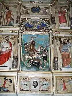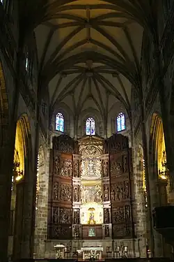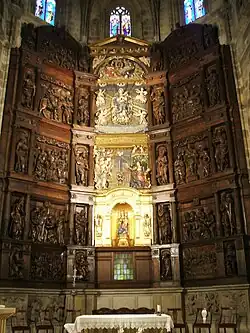 Contiene el retablo mayor, imponente obra renacentista realizada por los hermanos Beaugrant, quienes tallaron la parte derecha a partir de 1533, y Juan de Ayala, autor de las calles central e izquierda desde 1549. El ensamblaje de la mazonería, formada por predela, tres cuerpos y ático segmentados en tres calles y cuatro entrecalles, correspondió a Juan Imberto. La calle central está presidida por una talla gótica del siglo XIV de Santa María. Encima están representadas la Anunciación, la Asunción y la Trinidad. En las calles laterales aparecen representadas diversas escenas de la vida de Cristo. Entre las calles laterales se incluyen esculturas que representan a los evangelistas, los apóstoles y los padres de la Iglesia. Las diferencias de estilo entre los dos imagineros son claras: sobresale la expresividad y elegancia de Beaugrant frente al menor dinamismo de las figuras de Ayala. Fue sufragado con un legado del preboste Lope García de Salazar y Mena, muerto en 1536, cuyo escudo y figura aparecen en el zócalo de piedra en la base. Las obras fueron terminadas por Juan de Beaugrant y Juan de Ayala hacia 1555. La falta de medios económicos impidió el acabado policromado. Fue en 1749 cuando el artista Andrés de Rada pintó la calle central en estilo rococó. Este retablo fue sometido a una restauración entre 1986 y 1988.