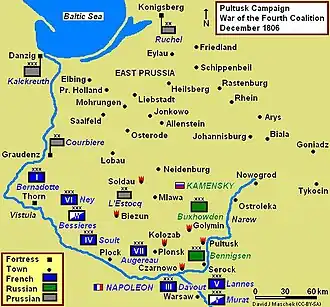 En diciembre, los prusianos sólo pudieron desplegar 6000 hombres, más las guarniciones de Danzig (Gdańsk) y Graudenz (Grudziądz). El mariscal de campo Mijaíl Kamensky dirigía el ejército ruso en Polonia, que contaba con unos 90 000 hombres en dos alas dirigidas por los generales Levin August, el conde von Bennigsen y Friedrich Wilhelm von Buxhoeveden (Buxhöwden).[3] A estas alturas, Kamensky mostraba claros signos de su incapacidad mental y física para el mando.[3]