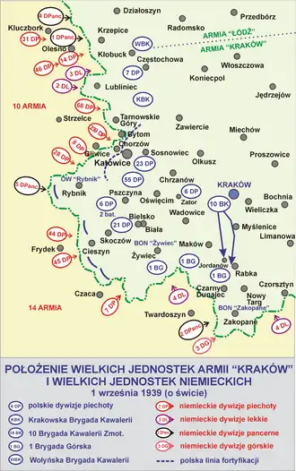 Los alemanes, atacaron la zona de Woźniki, rompieron las defensas de la brigada de caballería de Cracovia. También en el sur, destrozaron las posiciones polacas, y la 6.ª División de Infantería polaca se retiró apresuradamente hacia Oswiecim. Así, las unidades en la zona de Pszczyna y Mikołów fueron cercadas.