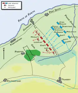 Reunido con Fowke y la caballería en Dunbar, Cope confiaba en no tener muchos problemas para derrotar a un ejército jacobita mal armado de menos de 2.000 hombres.[6] Por su parte, Carlos había ordenado a sus tropas dirigirse hacia el este desde Edimburgo, y ambos ejércitos se encontraron el 20 de septiembre por la tarde. Cope dispuso sus fuerzas mirando al sur, con una zona pantanosa inmediatamente al frente, muros del parque protegiendo su derecha y cañones detrás del terraplén de la ruta de vagones de Tranent a Cockenzie, que cruzaba el campo de batalla.[7]