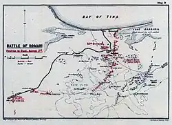 La batalla de Romani, librada entre el 3 y el 5 de agosto de 1916, fue el último ataque terrestre contra el canal de Suez durante la Primera Guerra Mundial. La batalla tuvo lugar a 37 km al este del canal de Suez, cerca de la localidad egipcia de Romani y las ruinas de la antigua Pelusio en la península del Sinaí. La victoria de las divisiones 52.ª de infantería británica y de caballería Anzac sobre una fuerza conjunta de los imperios otomano y alemán que cruzaban el Sinaí marcó el final de la campaña de defensa del canal de Suez, que había empezado el 26 de enero de 1915. Esta victoria del imperio británico, la primera sobre los otomanos en la guerra, aseguró el canal de Suez contra los ataques terrestres, y terminó con las aspiraciones de las Potencias Centrales de interrumpir el tráfico del canal. La persecución realizada por la división de caballería Anzac que terminó en Bir el Abd el 12 de agosto también marcó el inicio de la campaña del Sinaí y Palestina. A partir de ahí, la división de caballería Anzac apoyada por la brigada de camellos imperial pasaron a la ofensiva persiguiendo al ejército alemán y otomano durante muchos kilómetros a través del Sinaí, dando la vuelta a la derrota sufrida en Katia tres meses antes.[1]