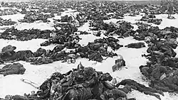 La batalla de Stalingrado fue un gran enfrentamiento bélico entre el Ejército Rojo de la Unión Soviética y la Wehrmacht (Fuerzas Armadas) de la Alemania nazi y sus aliados del Eje, por el control de la ciudad soviética de Stalingrado, actual Volgogrado, entre el 23 de agosto de 1942 y el 2 de febrero de 1943.[19][20][21][22] La batalla se desarrolló en el transcurso de la invasión alemana de la Unión Soviética, en el marco de la Segunda Guerra Mundial.[20][21] Con bajas estimadas en más de dos millones de personas entre soldados de ambos bandos y civiles soviéticos, la batalla de Stalingrado es considerada la más sangrienta en la historia de la humanidad. La grave derrota de la Alemania nazi y sus aliados en esta ciudad, significó un punto clave y de severa inflexión en los resultados finales de la guerra,[23] representando el principio del fin del nazismo en Europa,[23] pues la Wehrmacht nunca recuperaría su capacidad ofensiva ni obtendría más victorias estratégicas en el Frente Oriental.[24] Asimismo, a partir de esta derrota, la Alemania nazi estaría en un continuo retiro de todas sus administraciones militares hasta el fin de la Segunda Guerra Mundial en 1945.