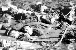 ![]() Soldados japoneses muertos mientras trataban de asaltar las posiciones de los marines estadounidenses, yacen en los bancos de arena en la desembocadura de río Tenaru en Guadalcanal, después de la batalla. | ||||