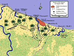 - ↑ Varios recuentos oficiales militares de los Estados Unidos identifican la posición al este de las defensas del perímetro de Lunga como el río Tenaru, sin embargo, el Tenaru está ubicado más al este. El río que formaba el límite al este es de hecho el río Ilu. El Ilu no era realmente un río, sino una laguna de mareas separada del océano por un banco de arena de entre 7 y 15 metros de ancho y 30 metros de largo. Frank, 1990, p. 150.