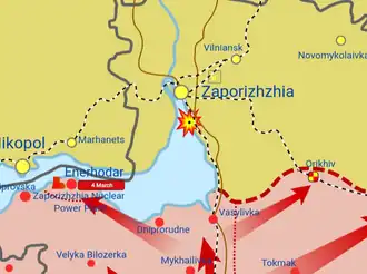 La batalla de Zaporiyia es un enfrentamiento militar en curso que comenzó el 27 de febrero de 2022, durante la invasión rusa de Ucrania de 2022, como parte de la ofensiva de Jersón. Zaporiyia es una ciudad importante a lo largo del río Dniéper en el centro de Ucrania.