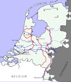 Gran parte de la defensa de los Países Bajos dependía de la "Línea de Agua", creada en el siglo XVII y obviamente obsoleta para 1940. Sin dejarse desanimar los neerlandeses la movieron un poco más al este en el siglo XIX. En 1940 colocaron puestos de guardia. La "Línea de Agua" estaba colocada de forma tal que los suelos delante de ella podían ser fácilmente inundados, convirtiendo el campo de batalla en un lodazal. El área atrás de la línea fue llamada ingenuamente Vesting Holland ("Fortaleza Holanda"). Se planeó inicialmente replegarse a esa zona ante la invasión alemana, con la esperanza de que este país solo ocuparía las provincias del sur necesarias para invadir Bélgica y dejaría el resto de los Países Bajos en paz.