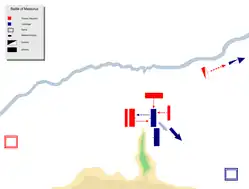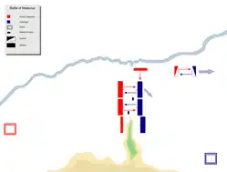 Despliegue inicial de la batalla. Romanos en rojo y cartagineses en azul. | ||||