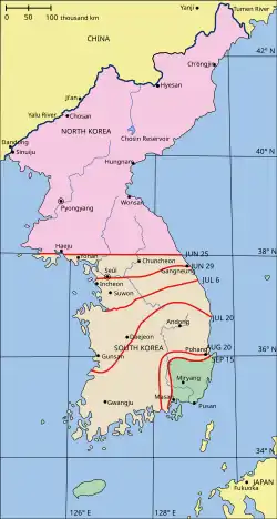 En el este, el ejército norcoreano, de 89.000 soldados, había avanzado hacia Corea del Sur en seis columnas, tomando al ejército surcoreano por sorpresa y desbandándolo completamente. El más pequeño ejército surcoreano sufría de una difundida carencia de organización y de equipamiento y no se encontraba preparado para una guerra.[14] Numéricamente superiores, las fuerzas norcoreanas destruyeron la resistencia aislada de 38.000 soldados surcoreanos en el frente antes de moverse constantemente hacia el sur.[15] La mayoría de las fuerzas surcoreanas retrocedieron ante el avance. Para el 28 de junio, los norcoreanos habían capturado la capital de Corea del Sur Seúl, forzando al gobierno y sus destrozadas fuerzas a retroceder aún más hacia el sur.[16] Aunque fueron constantemente hechas retroceder, las fuerzas surcoreanas aumentaron su resistencia a la medida que estaban más al sur, esperando retrasar a las unidades norcoreanas lo más posible. Las unidades nor y surcoreanas lucharon por el control de muchas ciudades, inflingiéndose fuertes bajas unas a otras. El ejército surcoreano defendió fieramente Yongdok antes de ser forzado a retroceder y logró repeler a las fuerzas norcoreanas en la batalla de Andong.[17]