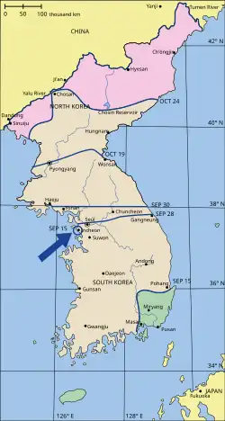 Las fuerzas de las Naciones Unidas establecieron un perímetro alrededor de la ciudad portuaria de Pusan durante julio y agosto de 1950. De aproximadamente 140 millas (225 km) de largo, el perímetro iba desde el estrecho de Corea al mar de Japón al oeste y norte de Pusan.[23] Al oeste el perímetro estaba delimitado aproximadamente por el río Nakdong donde rodeaba a la ciudad de Taegu, excepto por la parte más sureña de 15 millas (24 km) donde el Nakdong giraba hacia el este después de confluir con el río Nam.[24] La frontera norte era una línea irregular que transcurría por en medio de las montañas desde Waegwan y Andong a Yongdok.[23]