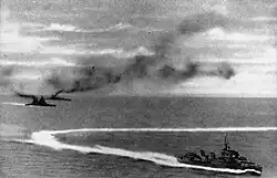 ![]() Los tripulantes del HMS Prince of Wales abordan los botes salvavidas momentos antes de que el acorazado se hunda. | ||||