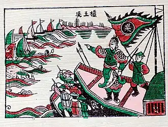 - ↑ Las fuentes de la época hablan de 400.000 hombres; pero estudios posteriores han sugerido que realmente se trataban de dos ejércitos de 20.000 hombres cada uno (40.000 en total) comandados por Liu Hongcao el primero y por Liu Yan el segundo.