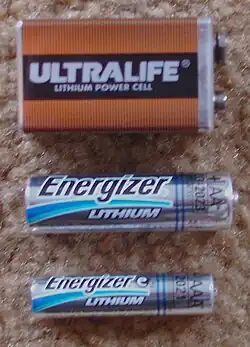 Una batería de litio es una celda galvánica primaria (desechable o no recargable) que tiene el ánodo de metal de litio o compuestos litio. Se distingue de otras baterías en su alta densidad de carga (larga vida) y el alto costo por unidad. Dependiendo de los compuestos de diseño y químicos utilizados, las células de litio pueden producir voltajes de 1,5 V (comparable a una batería de zinc-carbono o alcalina) a aproximadamente 3,7 V.