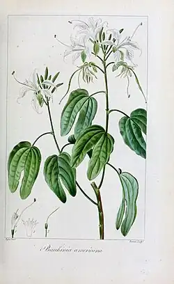 Bauhinia: nombre geneérico nombrado en honor de los hermanos herboristas y botánicos suizos; Caspar (1560-1624) y Johann Bauhin (1541-1613). El primero fue botánico y médico, autor de un índice de nombres de plantas y sus sinónimos llamado Pinax Theatri botanici, y profesor de anatomía y botánica en la Universidad de Basilea, que distinguía entre género y especie, y fue el primero en establecer un sistema científico de la nomenclatura, mientras que el segundo fue coautor de la gran obra Historia Plantarum universalis, publicado cuarenta años después de su muerte.[3]