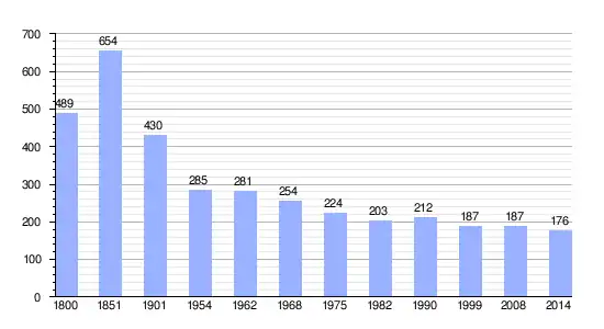Los datos demográficos contemplados en este gráfico de la comuna de Beaussac[4] se han cogido de 1800 a 1999 de la página francesa EHESS/Cassini, y los demás datos de la página del INSEE.[5]
