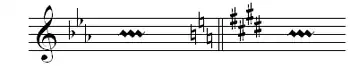 - Cuando son alteraciones propias forman parte de un cambio de armadura y se pueden dibujar en el pentagrama antes de la doble barra (ver Figura 3) que marca dicho cambio o bien después (ver Figura 4). Las alteraciones de esta clase aparecen siempre siguiendo un orden determinado, que en el caso del becuadro admite dos posibilidades:[4]