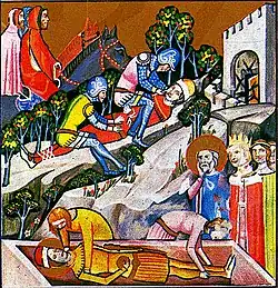 ![]() Retratado en una miniatura de la Chronica Hungarorum (Johannes de Thurocz, c. s. XVI). | ||