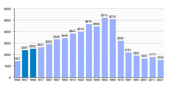 | Gráfica de evolución demográfica de Belvís de la Jara[6] entre 1842 y 2021 |