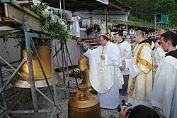 Desde tiempo inmemorial las bendiciones se verifican entre los católicos por medio de aspersiones de agua bendita, signos de cruces y rezos conformes al asunto que es objeto de la ceremonia. Cuando hay unción, entonces se llama consagración: así es que se consagra el cáliz, y se bendice el copón, porque se emplea la unción para el cáliz. Estas palabras se confunden a veces en el uso. Los obispos, cuando atravesaban las iglesias o a su paso por las calles, daban su bendición al pueblo. En otro tiempo, cuando iban por las calles de la ciudad o entraban en algún pueblo o aldea, se tocaba una campanilla para advertir a los fieles que viniesen a recibir su bendición. Cuando iban a la corte no se volvían sin haber dado la bendición al rey. En la iglesia se bendice a los fieles al tiempo de acabarse la misa.