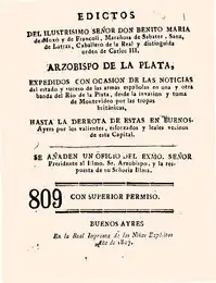 Al llegar la noticia de las Invasiones Inglesas a Buenos Aires, hizo llegar grandes donaciones de la Iglesia y de sus fieles al virrey Sobremonte, y luego la enorme suma de 6.000 pesos a su sucesor, Liniers, para la Defensa.