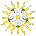 El León Blanco de Mortimer desciende a la Reina a través de Eduardo IV. El escudo muestra una rosa blanca rodeada por un sol dorado, conocido heráldicamente como una "rosa blanca en soleil", que en realidad es una combinación de dos distintivos diferentes. Ambos aparecen en los Grandes Sellos de Eduardo IV y Ricardo III, y fueron utilizados por Jorge VI cuando era Duque de York. A diferencia del León de Inglaterra, esta bestia no tiene corona.[3] |