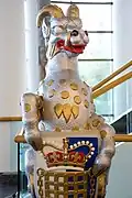 El grifo de Eduardo III es una antigua bestia mítica. Fue considerada una criatura benéfica, que significa coraje y fortaleza combinada con tutela, vigilancia, rapidez y visión aguda. Fue estrechamente asociado con Eduardo III, que lo grabó en su sello privado. El escudo muestra la Torre Redonda del Castillo de Windsor (donde nació Eduardo III) con el estandarte real sobre la torreta, rodeado por dos ramas de roble coronadas por la corona real.[3] |