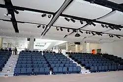 La planta baja alberga un auditorio de 300 asientos que también sirve como espacio de lectura cuando no está en uso para actuaciones. La directora ejecutiva de la biblioteca, Judith Hare, afirmó que el espacio complementaría un estudio de grabación, dirigido a los jóvenes, planeado en otra parte de la biblioteca: "la gente puede hacer su propia música... pero también tendrán un lugar para actuar".[66] En 2012, el auditorio fue nombrado Paul O'Regan Hall luego de una donación de $ 1 millón de la familia O'Regan en honor al fallecido empresario y filántropo. Los fondos del gobierno solo cubrieron el costo del edificio, por lo que las donaciones se destinarán a ampliar la colección de libros y comprar nuevas computadoras y equipos especiales. La sala está equipada con asientos plegables, deflectores acústicos en el techo, pantalla de video e instalaciones profesionales de iluminación y sonido.[67]