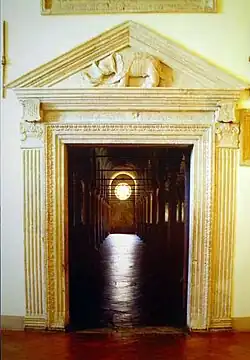 Sobre el tímpano se observa un elefante, emblema de la familia Malatesta: