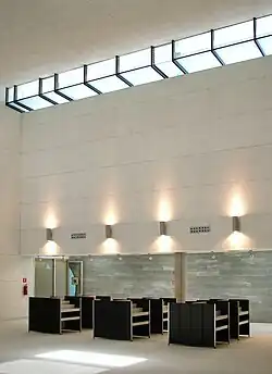 - Espacio vertebrador espacial y de relación de todo el edificio con escalera principal de acceso a la planta primera. Toda la biblioteca es visible desde este hall donde e una señalética de gran formato en las superficies acristaladas de las distintas espacios que se asoman al mismo, informa al usuario de un solo vistazo de todos las áreas y servicios disponibles Dispone de una zona de exposiciones. Estos espacios cuentan con lucernarios de iluminación cenital orientados en dirección de la luz solar del SOLSTICIO de verano (día de especial significación para la ciudad de Tres Cantos) así como taquillas, reprografía y cuarto de seguridad.