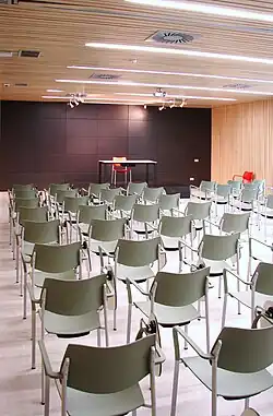 - Para usos diversos (conferencias, cuenta-cuentos, talleres, proyecciones, etc…) y subdivisible en dos salas con una capacidad total para 96 asientos, que cuenta con un frente corrido de almacenamiento para guardar todo el mobiliario de las dos salas.