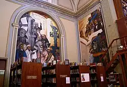 - Mural “La conquista” pintado por Hollis Howard Holbrook en 1952, se ubica en el muro norte del sotocoro. Realizado en la técnica de pintura al fresco, mide 2.0 x 3.0 m.