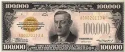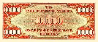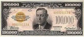 El billete de cien mil dólares fue creado en 1934 por los Estados Unidos de América, para uso exclusivo de los bancos del país, así como para su Reserva federal. Se crearon unos Diez Millones,[1] de los cuales, en el 2009, unos veinticinco mil estaban bajo el poder de la Reserva. El billete lleva impresa la imagen de Woodrow Wilson y solo se utilizó para transacciones internas entre los Bancos de Reserva Federal. Los billetes ocuparon el duodécimo y último lugar en denominaciones de billetes de dólares.[1]