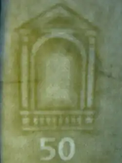 - Marca de agua: Al mirar el billete al trasluz, se aprecia el valor del billete y el motivo principal. Además, se puede ver una serie de barras a la derecha de la marca de agua. El número y anchura de estas barras indica el valor del billete. Si se escanean, estas barras se convierten en codificación Manchester.
