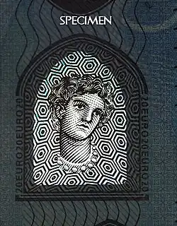- Ventana con retrato: Al mirar el billete al trasluz, la ventana del holograma se vuelve transparente y muestra un retrato de Europa en ambas caras del billete. Al girar el billete, la ventana del holograma muestra líneas multicolor alrededor de la cifra que indica el valor del billete. En el reverso, dentro de la ventana, aparecen números multicolor que muestran el valor del billete.