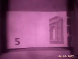 - Propiedades bajo una luz ultravioleta: Bajo una luz ultravioleta, el papel del billete no resplandece. Se aprecian fibras de color rojo, azul y verde embebidas en el papel, la bandera de la Unión Europea resplandece en verde y las estrellas adquieren una tonalidad anaranjada. La firma del presidente del BCE se torna verde. Las estrellas grandes y los círculos pequeños situados en el centro resplandecen en color naranja. En el reverso, el mapa, el puente y el valor del billete aparecen en amarillo.