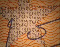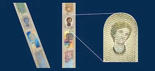 - Microtexto: Algunas zonas del billete muestran una serie de caracteres de tamaño reducido que pueden leerse con ayuda de una lupa. Los caracteres no son borrosos, sino nítidos.