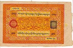 En 1937 o 1938, se pone en circulación el billete de 100 tam srang o simplemente 100 srang, en el que aparece inicialmente el mismo sello octogonal rojo de las primeras emisiones (que pronto será remplazado por otro circular más pequeño), junto a un nuevo tipo de sello negro con la inscripción: srid zhi'i dpal bar. Se imprimió regularmente entre 1939 y 1945 y, de nuevo, entre 1951 y 1959 –sin fecha–, resultando relativamente abundante aún dentro del mercado numismático.