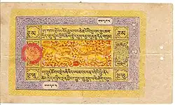 chos srid gnyis ldan gyi rab byung bco lnga bai shog dngul1658 años desde la fundación de la secular forma religiosa de gobierno en el gran país del Tíbet, la tierra de las nieves, el papel moneda del 15.º ciclo (rab byung) del gobierno de la religión y la política (chos srid gnyis ldan), la joya universal de beneficio y bendición, dotada de las cuatro clases de auspicios.Traducción propuesta por el personal del Tibetan Works and Archives de Dharamsala.