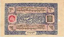 Los primeros billetes del Tíbet se emitieron entre 1912 y principios de 1913 (1658-59 del calendario tibetano), con valores faciales de 5 (verde o azul), 10 (rojo), 15 (violeta), 25 (marrón o amarillo) y 50 (azul o púrpura) tam,[1] numerados a mano con tinta negra por calígrafos autóctonos especialmente entrenados para ello. Presentan en el anverso un sello rojo a la izquierda, símbolo de la autoridad del dalái lama, otro, negro a la derecha, de la «Tesorería del Gobierno» o «Banco del Gobierno», junto al siguiente texto escrito en alfabeto 'Phags-pa: