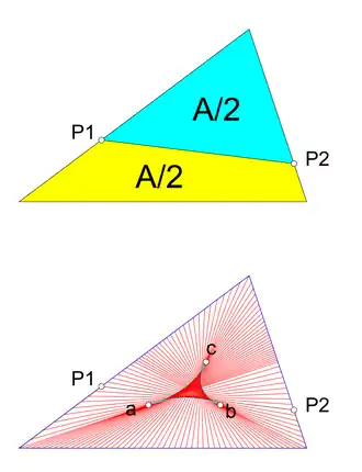 La envolvente de la infinitud de las rectas bisectoras del área es una deltoide (en general, definida como una figura con tres vértices conectados por curvas que son cóncavas hacia el exterior del deltoide, lo que hace que los puntos interiores sean un conjunto no convexo).[11] Los vértices del deltoide están en los puntos medios de las medianas; en todos los puntos dentro del deltoide se cortan tres bisectores del área diferentes, mientras que todos los puntos externos están solo en uno.[12] Por los puntos de la frontera, excluidos los vértices, pasan dos bisectores, y por los vértices uno solo, la mediana correspondiente. Los lados del deltoide son arcos de hipérbola que son asintóticos a los lados extendidos del triángulo.[11] La relación del área de la envolvente de los bisectores del área con respecto al área del triángulo es invariante para todos los triángulos, pues se trata de un problema afín, e igual a es decir, 0.019860..., algo menos del 2%.