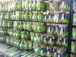 Diversas bombillas de bajo consumo en un comercio, cada una en su propio blíster de plástico transparente.