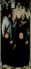 El panel de la izquierda muestra a Santiago, con bastón y sombrero de peregrino, y San Antonio Abad, con el bastón en tau, campanilla, el cerdito a los pies y leyendo una biblia, de pie tras los donantes arrodillados, Anthonis Seghers, hermano del hospital desde 1445 y desde 1461 y hasta su muerte en 1475 de manera intermitente Maestro del hospital, y el hermano Jacob Ceuninc, hermano desde 1469 y tesorero entre 1488 y 1490. El panel de la derecha muestra a Santa Inés, con el cordero a su lado, y Santa Clara, sosteniendo una custodia, de pie tras las donantes arrodilladas, Agnes Casembrood, priora del hospital desde 1455 hasta su muerte en 1489, y la hermana Clara van Hulson, hermana del hospital desde 1427 hasta su muerte en 1479. La ropa azul celeste de Santiago contrasta con los hábitos negros de los donantes y San Antonio, del mismo modo que al otro lado el vestido verde de Santa Inés con el blanco, negro y marrón de los hábitos de las donantes y Santa Clara. Memling rompe con la tradición también al no ubicar las figuras de los paneles en simulados nichos escultóricos, sino en un único espacio poco profundo con muros de piedra detrás. El historiador del arte Craig Harbison considera el estilo de Memling más realista y mesurado que el nervioso y escultórico de Rogier van der Weyden y que al separar las figuras profanas al exterior de las sagradas en el interior, implica más fuertemente que los artistas anteriores al devoto en una visión intimista de las imágenes sacras.