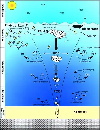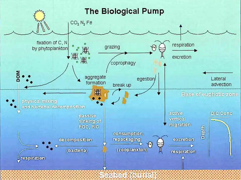 La bomba biológica es responsable de transformar el carbono inorgánico disuelto (CID) en biomasa orgánica y bombearlo en forma particulada o disuelta al océano profundo. Los nutrientes inorgánicos y el dióxido de carbono son fijados durante la fotosíntesis por el fitoplancton, que liberan materia orgánica disuelta (MOD) y son consumidos por el zooplancton herbívoro. El zooplancton más grande, como los copépodos, ingieren gránulos fecales que se pueden volver a ingerir y hundirse o acumularse con otros detritos orgánicos en agregados más grandes que se hunden más rápidamente. MOD es parcialmente consumido por bacterias (puntos negros) y respira; el MOD refractario restante se adveciona y se mezcla en las profundidades marinas. El MOD y los agregados exportados a las aguas profundas se consumen y respiran, devolviendo así el carbono orgánico al enorme depósito oceánico profundo de CID. Aproximadamente el 1% de las partículas que salen de la superficie del océano llegan al lecho marino y se consumen, respiran o se entierran en los sedimentos. Allí, el carbono se almacena durante millones de años. El efecto neto de estos procesos es eliminar el carbono en forma orgánica de la superficie y devolverlo a CID a mayores profundidades, manteniendo el gradiente oceánico de superficie a profundo de CID. La circulación termohalina devuelve el CID de los océanos profundos a la atmósfera en escalas de tiempo milenarias.[9]