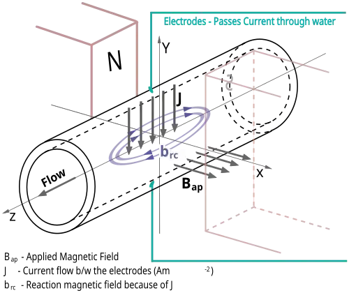 Este principio se utiliza en una bomba electromagnética. La corriente se alimenta a través de un líquido conductor. Dos imanes permanentes están dispuestos para producir un campo magnético Bap como se muestra en la figura. La corriente suministrada tiene una densidad de corriente (J) y el campo magnético asociado con esta corriente puede denominarse "Campo magnético de reacción (brc)". Los dos campos magnéticos Bap y brc intentan alinearse entre sí. Esto provoca el movimiento mecánico del fluido.
