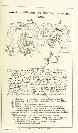 - ↑ Actualmente el topónimo Karanja aparece en los mapas en la península situada al sur-sureste de Colaba