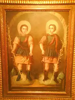 | Atributos | la palma, la espada, indicativas del martirio; la corona de laurel, por alusión a la milicia romana; | |