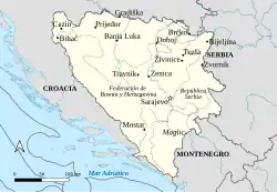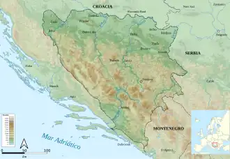 Bosnia y Herzegovina[nota 1]​ (en bosnio y croata, Bosna i Hercegovina; en serbio y bosnio cirílico,[5]Босна и Херцеговина), comúnmente llamada Bosnia-Herzegovina,[1]​ o simplemente Bosnia,[6]​ es un país soberano europeo, con capital en Sarajevo,[7][8]​ situado en la confluencia de Europa Central y del sudeste europeo, y que limita con Croacia, al norte, oeste y sur; con Serbia al este;[9]​ con Montenegro al este y al sur, y con el mar Adriático al suroeste a lo largo de 21,2 km.