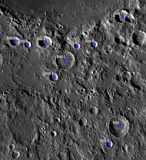 Por convención estos elementos son identificados en los mapas lunares poniendo la letra en el lado del punto medio del cráter que está más cerca de Boss.