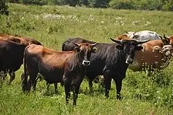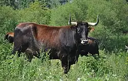 ![]() Toro de la raza taurus en la reserva natural de Lippeaue. | ||