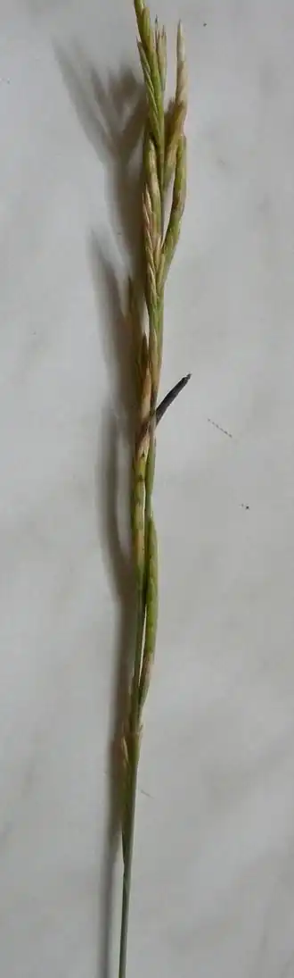 Llega a 1 m de altura, tiene una gran macolla con muchas hojas, rígida, áspera en las hojas, perenne y derecha. Sus espigas pueden medir 30 cm y tener has 15 espiguillas. Las espiguillas son cilíndricas o un poco aplastadas, de 2-4 cm de longitud y con varias flores alternadas, casi sin rabillo, pegadas al raquis, que se curva entre dos espiguillas, derechas o curvadas caprichosamente, disposición que hace muy llamativa a esta gramínea, apta para ornamentación. En la base de la espiguilla hay 2 glumas desiguales, poco apuntadas, con varios nervios verdosos. La flor de hasta 10 mm de longitud, verdosa, la lema o cubierta exterior con varios nervios y una arista o argaña de 2 mm de longitud, la pálea blanquecina, sin nervios, ambas con pelillos en el borde. Dentro hay 3 estambres alargados, con cuernos y 2 estigmas plumosos. El fruto alargado, de 3 mm de longitud.